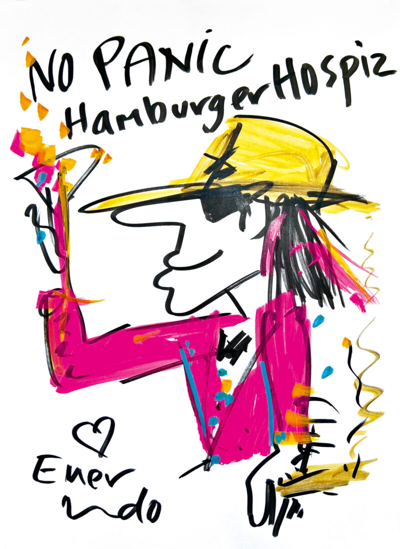 Ob Malerei, Fotografien, Porzellanplastiken, Holzschnitte oder Bronzestatuen: das Portfolio der Schenkungen ist so vielfältig wie die Künstler*innen: Musik-Legende Udo Lindenberg hat ein Selbstbildnis beigesteuert, der Panikrocker unterstützt die Benefiz-Kunstauktion seit Jahren und sagt: „Ich spende gern für das Hospiz, das eine so wertvolle Arbeit leistet.“ Streetart-Künstlerin „Frau Jule“ hat einer ihrer typischen, beschrifteten Teller („Liebe ist ein Tuwort“) gestiftet, den viele Hamburger*innen aus dem Straßenbild kennen. Von Illustratorin Jutta Bauer, die Anfang September verstorben ist, wird eine Bleistiftzeichnung versteigert. Persönliche Verbindung: Bildhauerin Doris Waschk-Balz (†) – bekannt für ihre Bronzefiguren am Spritzenplatz: „Ottenser Torbogen“ – verbrachte ihre letzten Tage im Hospiz im Helenenstift, starb im März 2025. Ihr Ehemann Klaus Waschk hat dem Hospiz als Dank drei Exponate geschenkt, um „die so wichtige und gute Arbeit im Hospiz etwas zu unterstützen“.